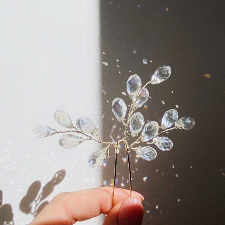 Matériaux utilisés : cristal tchèque, verre de Bohême, pinces à cheveux en métal, fil de bijouterie argent/or. 12 cm.